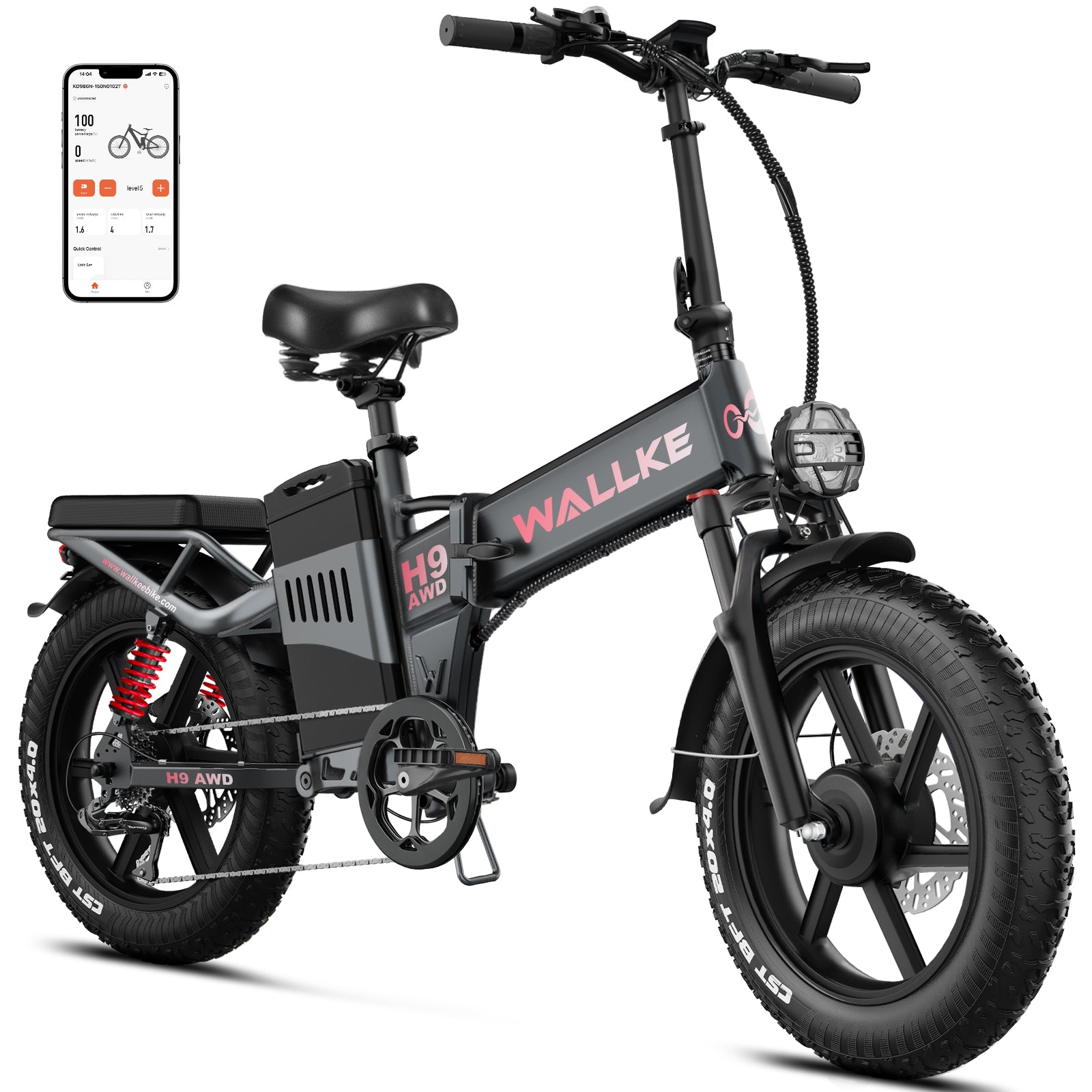 Wallke H9 AWD bike is equipped with a 750W (Peak 1200 Watt) front-mounted motor and a 1000W(Peak 1600 Watt) rear-mounted motor. Combined with Off-road fat tires can tackle any terrain.